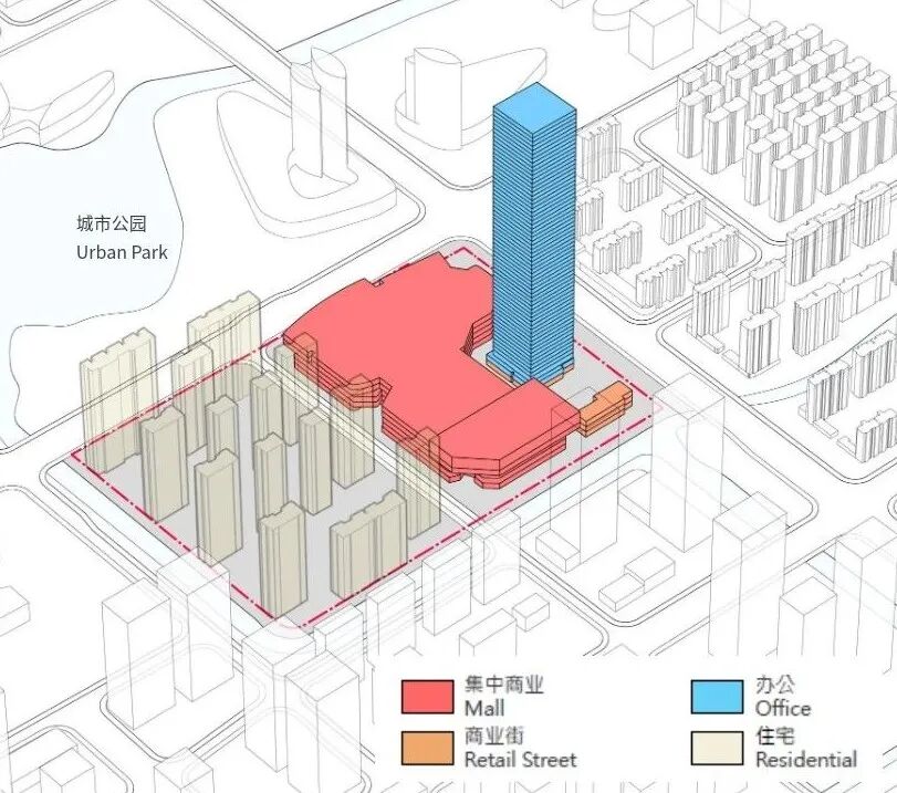 方案将地标写字楼独立置于场地东南,减少对周边住宅景观的遮挡,亦方便项目分期施工。购物中心体量环绕写字楼布局,合围出商业零售餐饮街区,东南角则退让出可供市民聚集的景观广场,亦形成了项目开阔的城市展示面。
