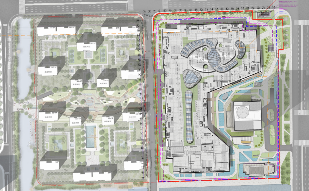 项目紧邻双轨交汇的地铁换乘站,北面与广阔的城市公园相依,南面及西面则为城市滨水空间环绕。密集的城市水系与景观生态系统,为基地片区带来得天独厚的生态环境,亦启发了项目的功能布局及公共开放空间序列。