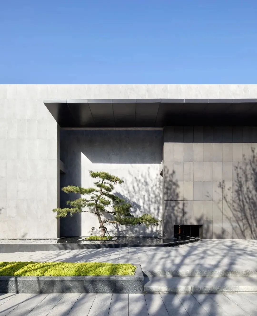 建筑主体外立面采用深灰色斧凿面石材干挂,通过切割、组合成若干个立方体的错落堆砌,厚重的体块底部悬空产生了一种视觉的冲突,进而增加戏剧性产生深度记忆点;