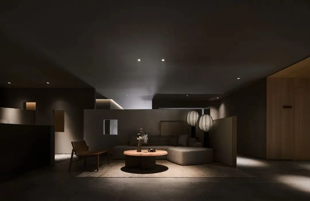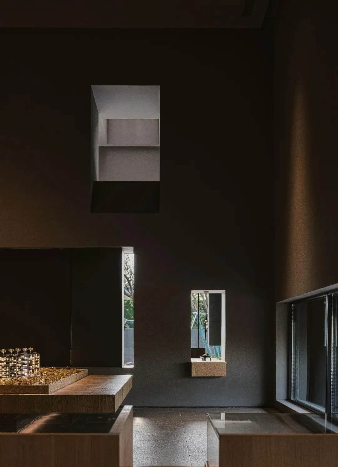进入门厅,一种神秘而纯粹的气息扑面而来,墙面和顶面通体深灰色调,透过墙面体块错开的缝隙和洞口,隐约能看到里面精致陈列的生活化场景。