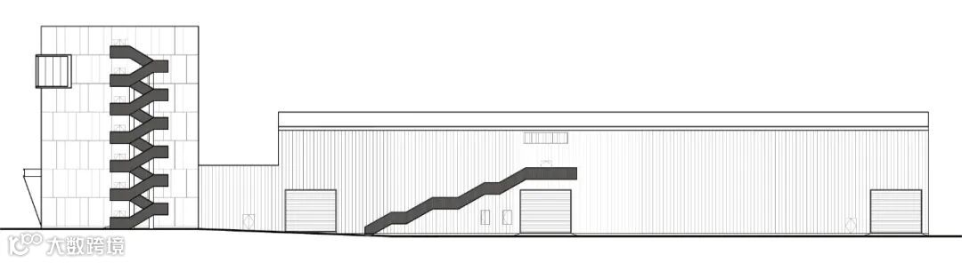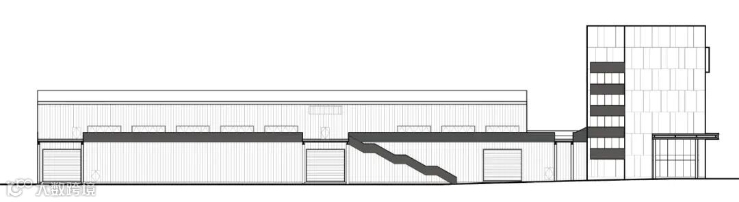 在办公楼沿城市支路一侧,同样设计了一部串联六层的室外楼梯,楼梯颜色、材质均与室内楼梯统一。外挂楼梯成为流线的终点,在道路交叉处结束,其功能不仅只是满足疏散的需求,同时也成为室外公共空间的一部分。