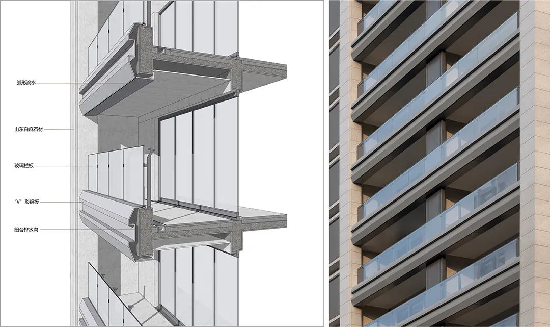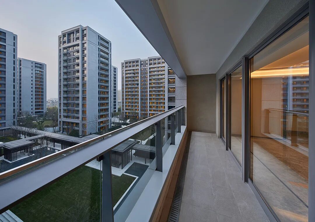 阳台外立面使用 “V”形铝板强化母题元素,突出阳台细部的构造感与工艺感。隐藏式排水沟,保证内部干净整洁。藏于内侧的栏杆,通透的玻璃外衬,简洁中体现精致,每一处的巧思,都传达隐奢精神。