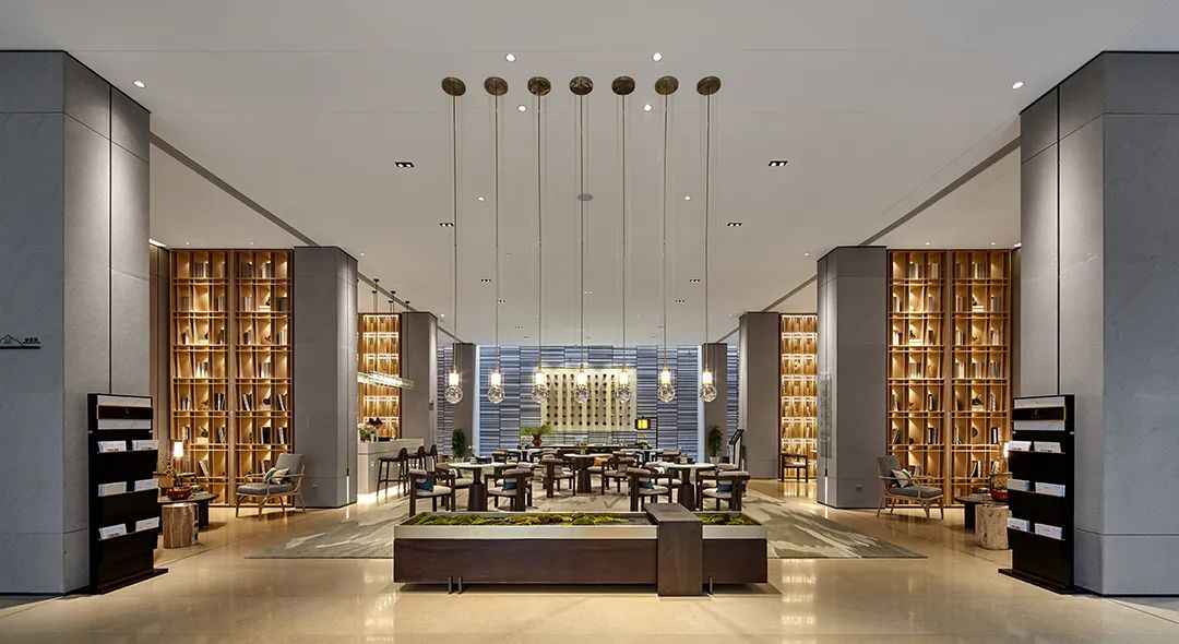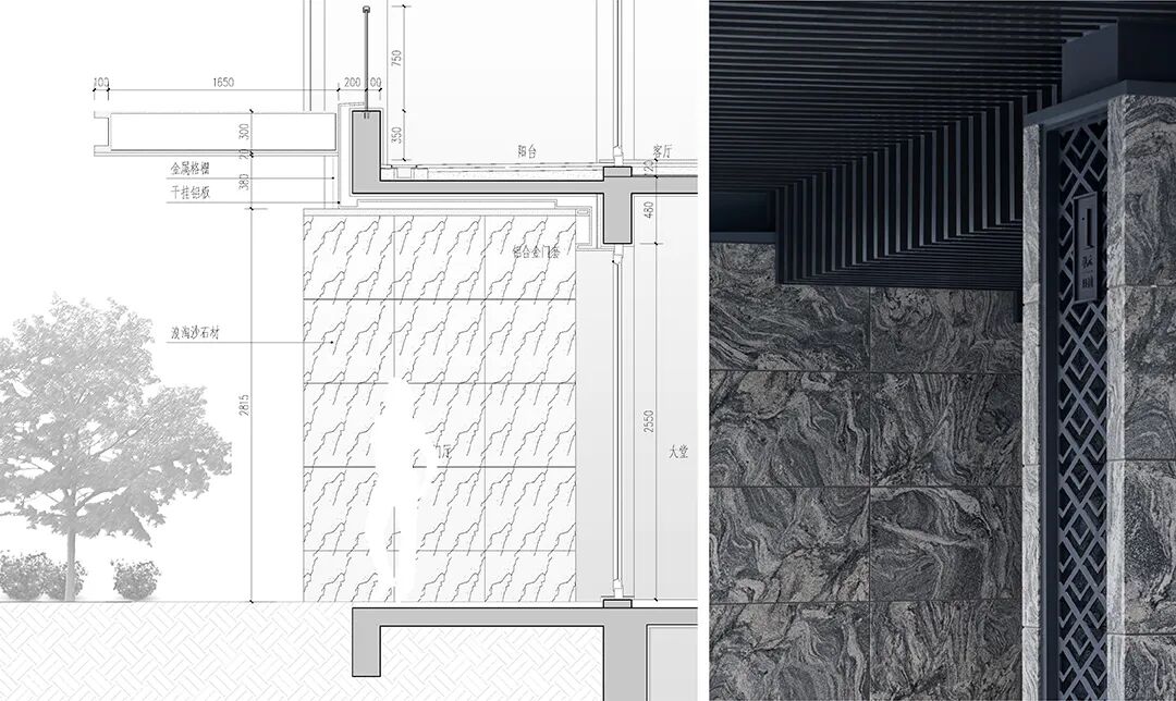 为了与整体外立面匹配,入户大堂的石材甄选了福建 “浪淘沙”,其纹理如大浪淘沙,写意的肌理感,仿佛看见宋人“天人合一”的精神内核;搭配着雨棚下方延展出的“V”形水纹格栅,不仅体现入户大堂的归家尊崇感,更呼应了滨水社区的定义。