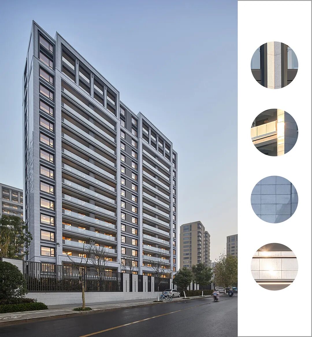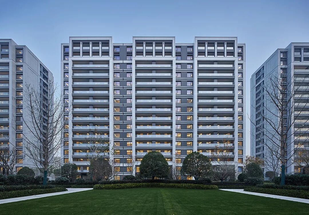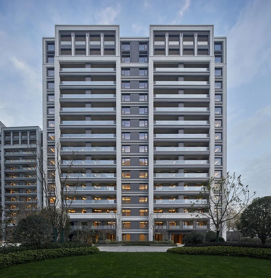 立面表达上,设计以宋瓷作为美学原点,深挖汝窑的极简主义基调,贵雅气质的现代东方工艺风,结合现代建筑的通透性、精工技术和中式文脉于一体,展现建筑形体的匀整美与不张扬的性格,强调现代住宅的识别性与时代感。