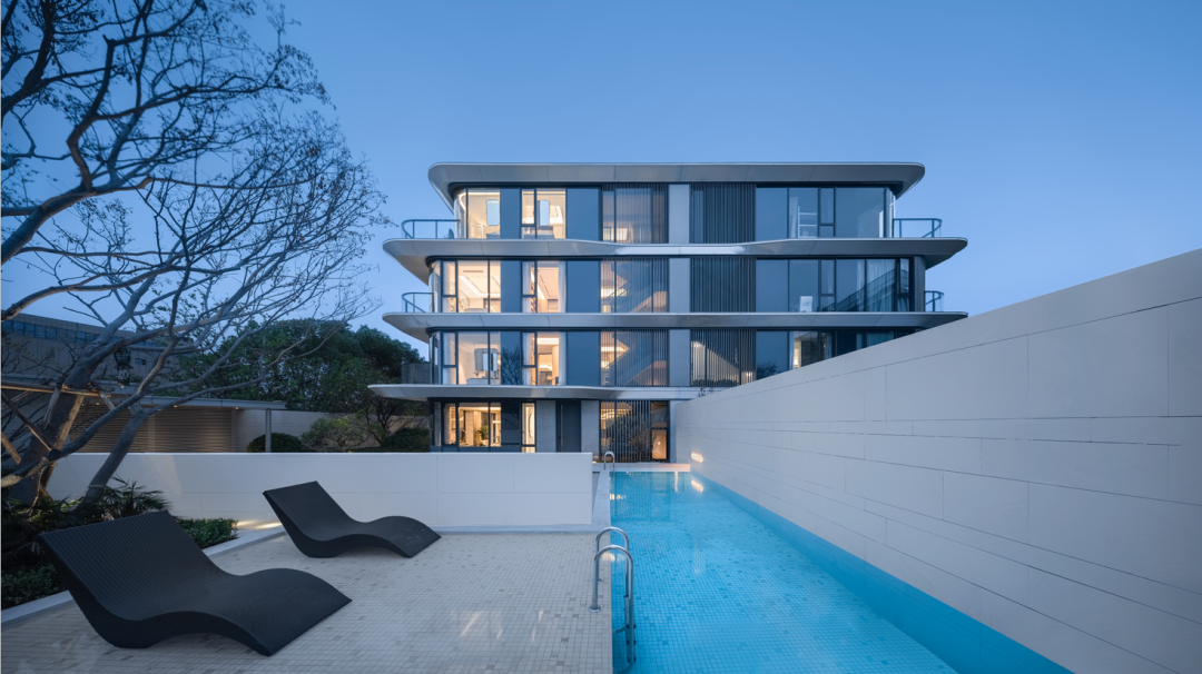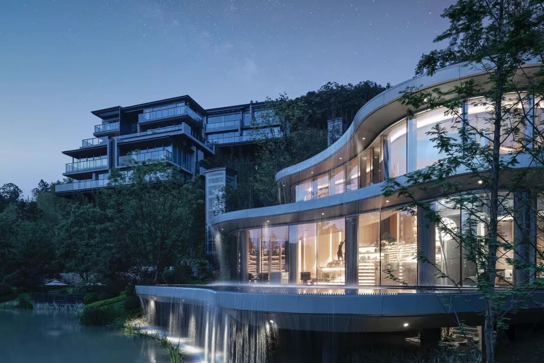 建筑涵盖类独栋、双拼、三联排等型制,汲取东方风骨,以玻璃为主材,让建筑消隐于自然,获得沉浸式体验。