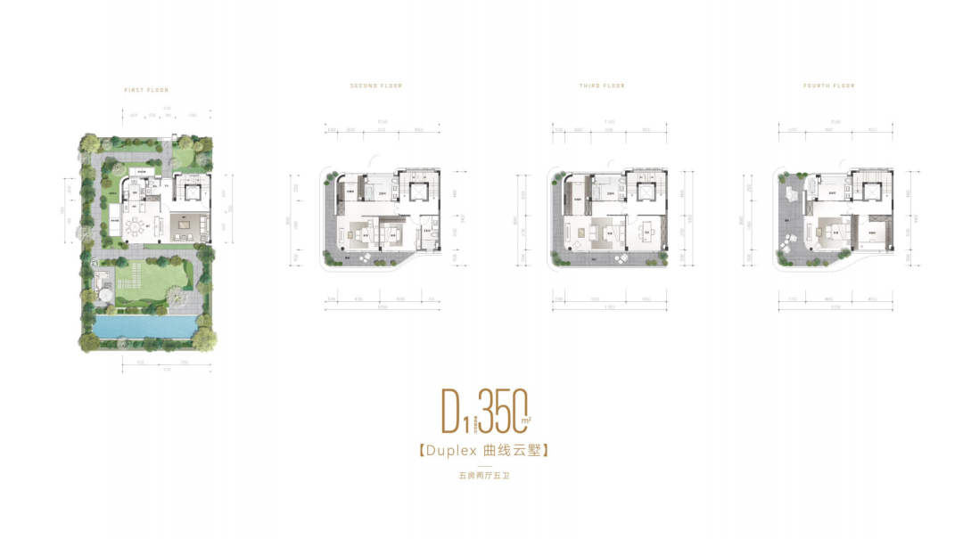 建筑面积约338㎡户型:两层空间设计了五房四套房的格局,并拥有约11.8米的南向面宽。