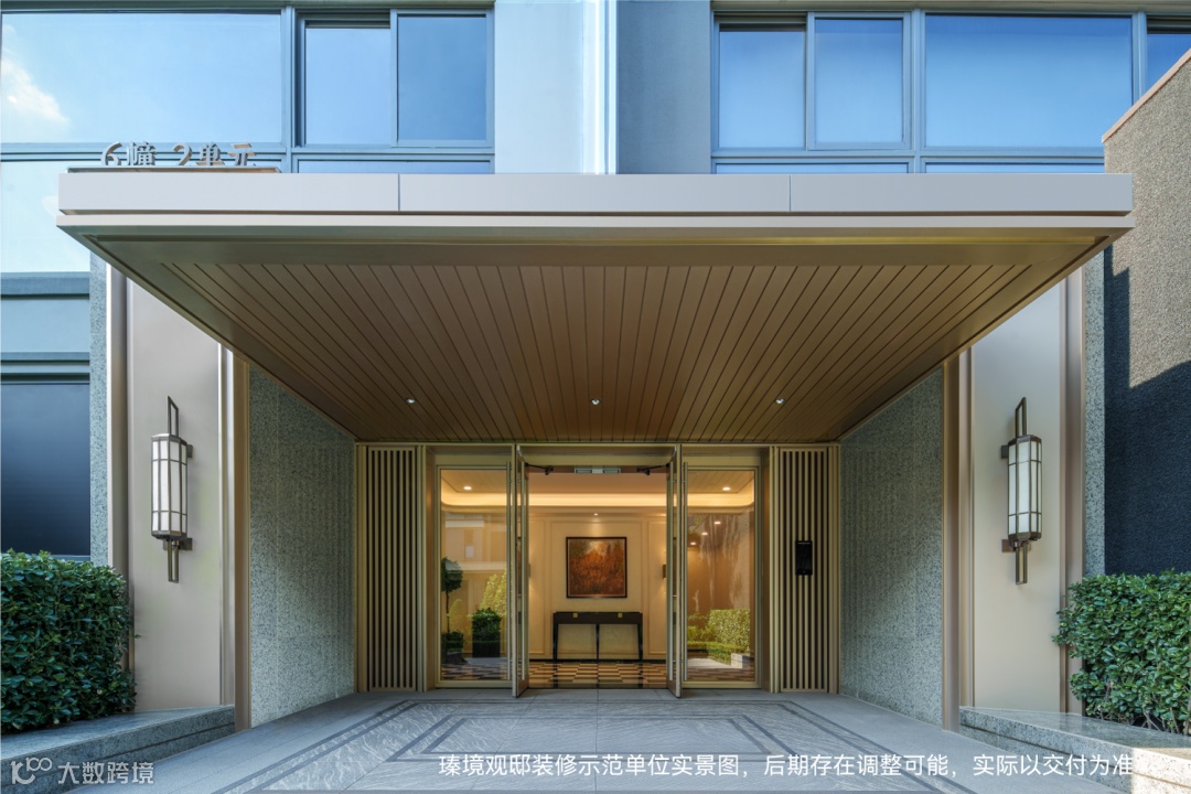 归家门庭高约9米、宽约67米,是以清朝巨贾胡雪岩故居芝园为蓝本,青砖白壁的手法,把“高门隐贵”的气质展现得淋漓尽致。