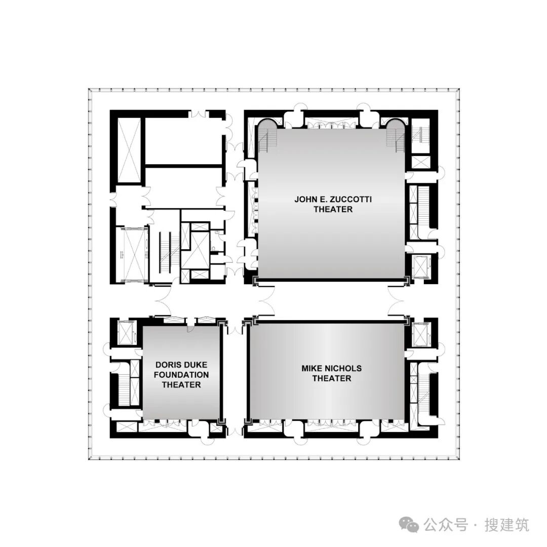 此外,剧院周围的可变区域由八个隔音门、十字形的场景停靠点/集会处以及外围的循环环路组成,可以将这些区域中的任何一个分配为前厅或后厅,形成意想不到的大厅和演出前厅。四部电梯/楼梯也可单独使用或组合使用,从大堂开始形成不同的循环序列。由于这种巨大的灵活性,纽约 PAC 不断给观众带来惊喜,成为一个 "神秘的盒子",其体验完全由每位导演的想象力编排。