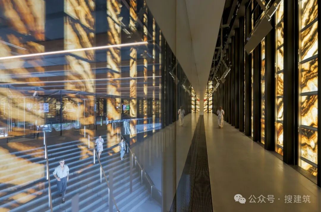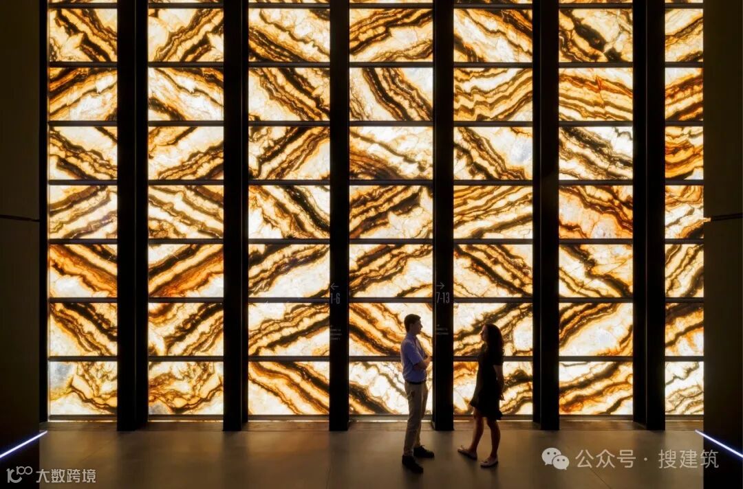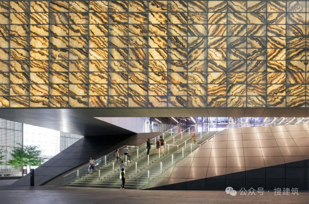 建筑的纯粹形式--旋转和升高以适应复杂的地面和地下限制--由半透明的大理石包裹。白天,它是一座优雅的、与书本相匹配的石头建筑,与街对面庄严肃穆的 9/11 纪念碑遥相呼应。到了晚上,这座巨石就会变得非物质化,巧妙地展现出 PAC NYC 内部的创意能量。