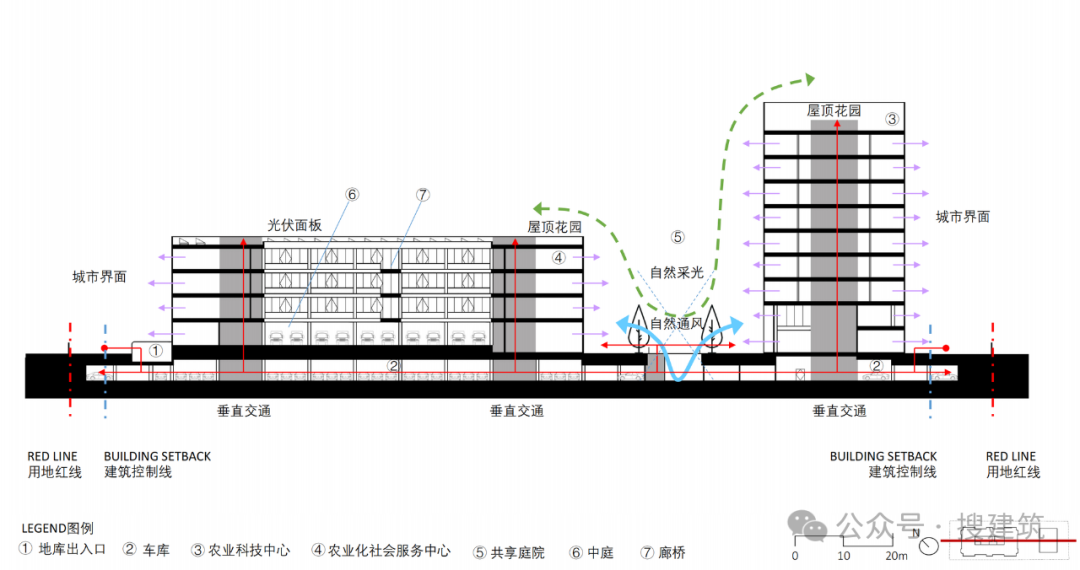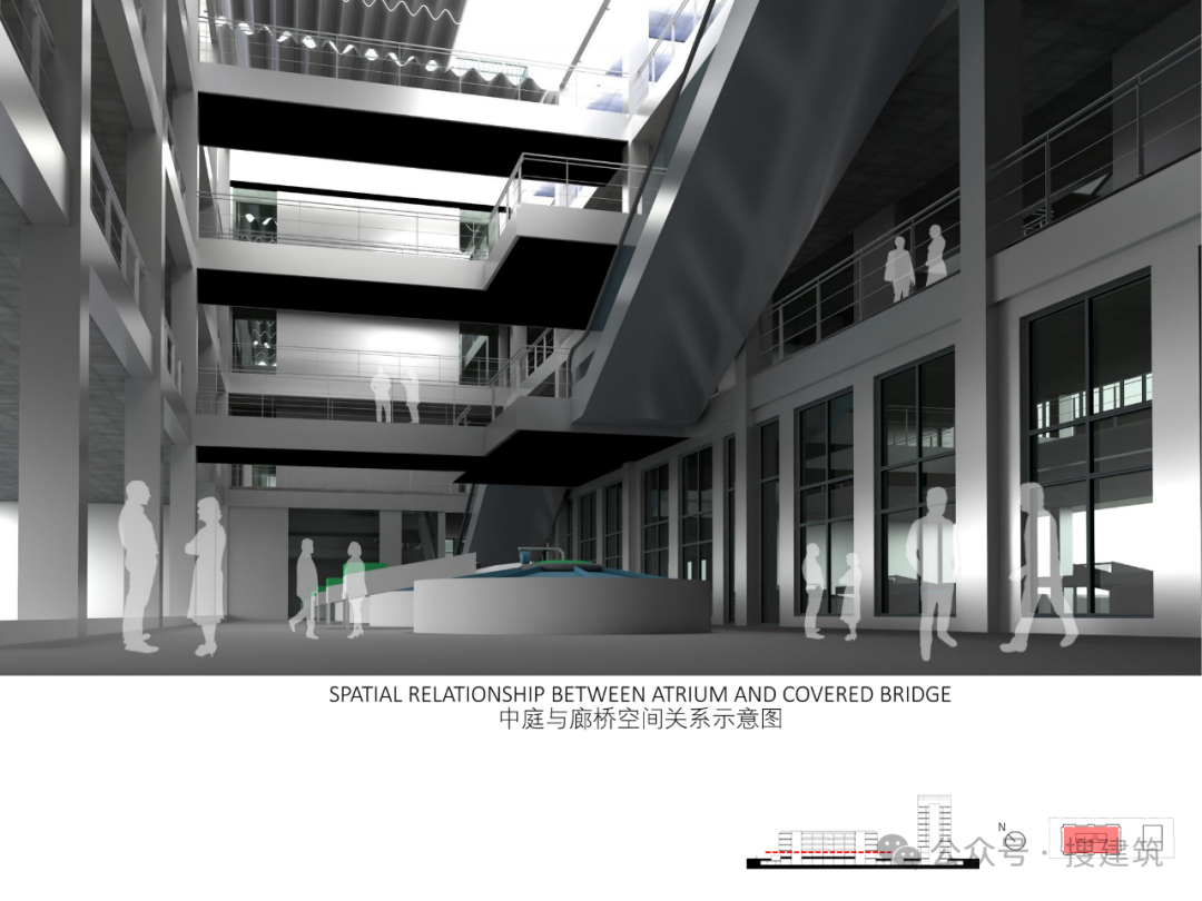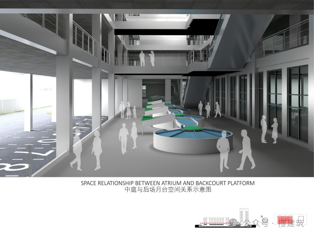 场所精神:有特色的工作环境大大影响区域活力、互助合作精神和工作效率。例如菜场机动车物流流线北置的安排;步行化人性化的庭院广场;引进自然通风与采光的农产品批发市场中庭设计;建筑退台引入空中花园等。大型公共艺术装置雕塑结合“龙港”的历史文脉,以龙为灵感,有机结合场地,打造富有项目场地精神的城市街区风貌。