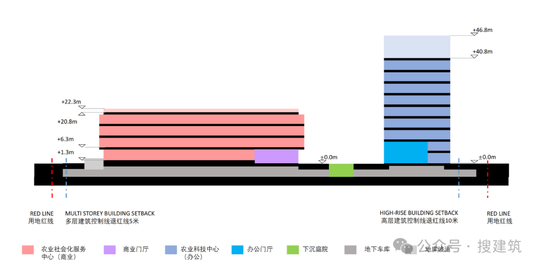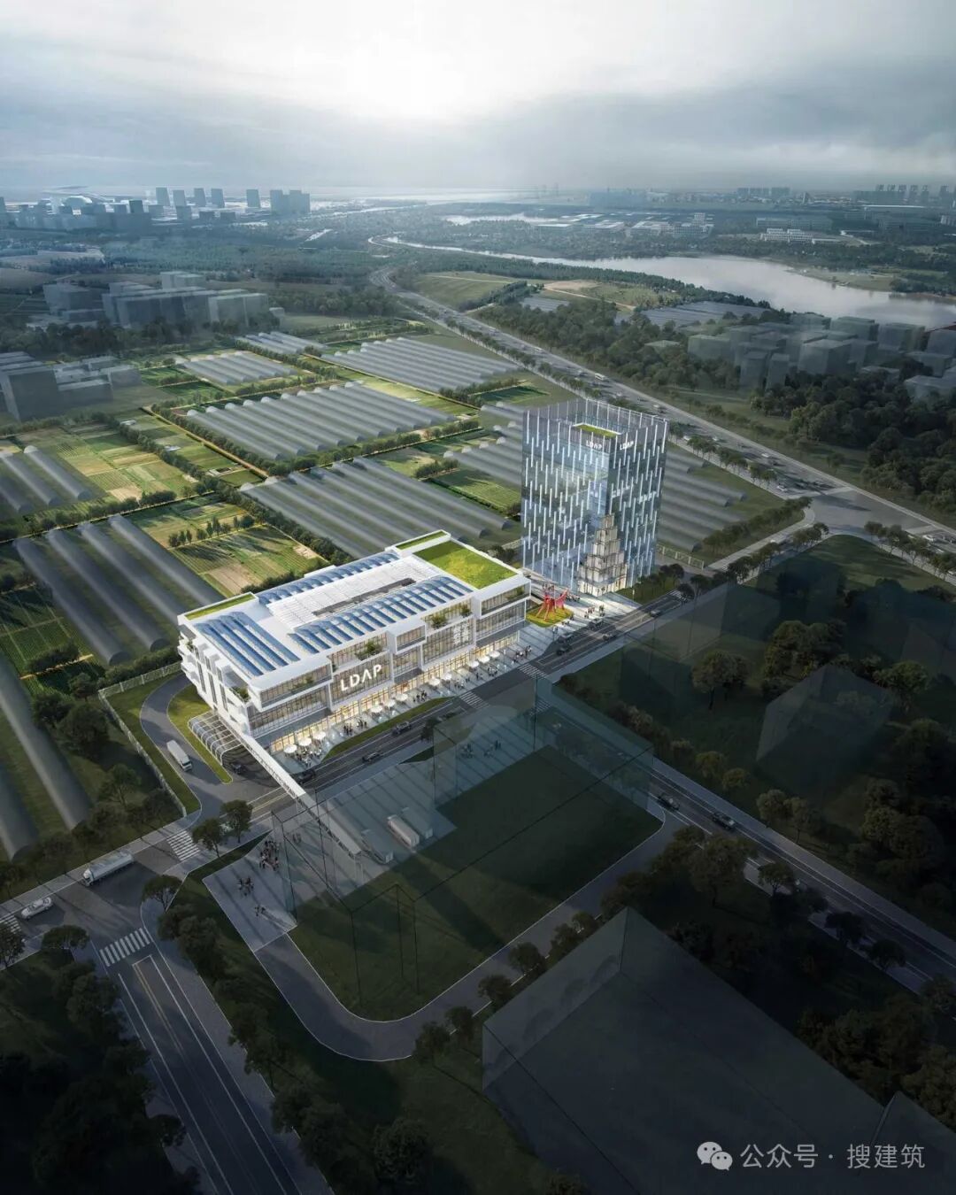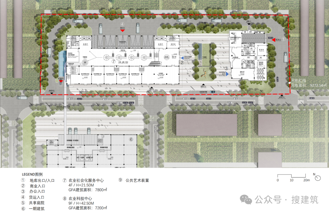 从两个建筑体量看均属于中小型配套商业建筑。结合一期项目,合理布局农业化社会服务中心办公楼与农业科技中心的建筑空间组合关系,合理安排物流流线,合理释放共享公共空间,强化塔楼地标展示效果与优化城市街区界面是本项目的优势所在,二期与一期项目的业态差异化,有利于两个项目协同发展,共享客源。