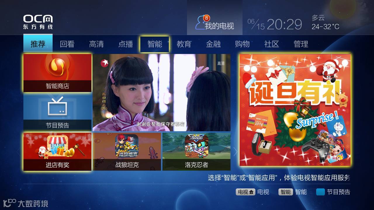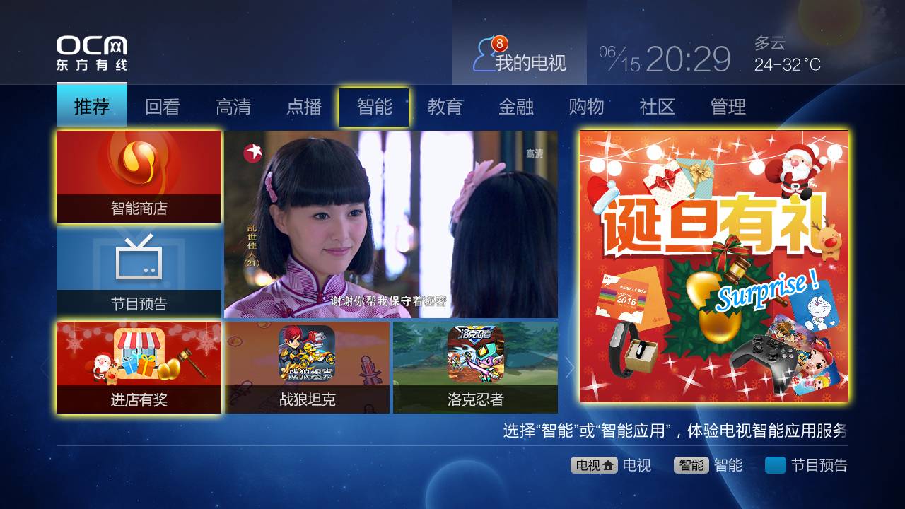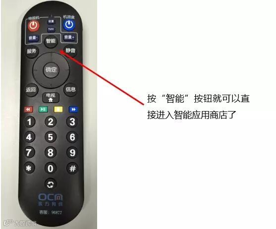 2、点击遥控器上的“智能”按键,直接进入智能应用商店,找到“进店有奖”应用,登陆使用就可以免费参与了。