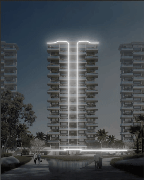 设计回归传统人居理念,利用270°环绕景观打造错层全景露台,奇偶层露台错位,形成通高院落及多维度的城市上空森野谧境。露台通过使用弧形精工化建筑线条及通透天幕玻璃立面,增加建筑的流畅感和未来感,打造奥体片区独特IP标杆形象。