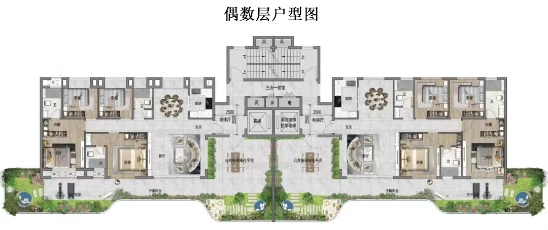 每户超大公共平台与空中花园,奇数层是南公共平台与南空中花园组合,偶数层是北公共平台与北向及山墙向空中花园组合。