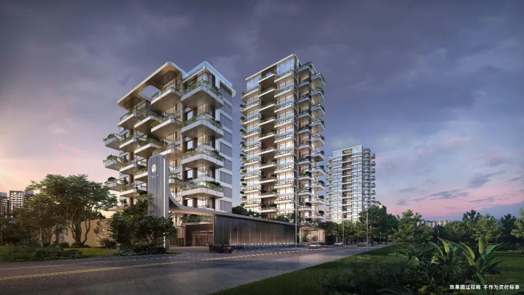 广宇设计采取元素符号景观提取转译,将景观元素应用于立面高层大线条处,通过再设计实现丰富观感;将古建元素应用于高层转角阳台,通过弧面玻璃反射效果,形成兼具传统美学与文艺美学特征的立面形象,影显项目的独特性和尊贵感。建筑长出森境,自然包裹立面,层层叠翠,筑就一座会呼吸的城市“森林”。