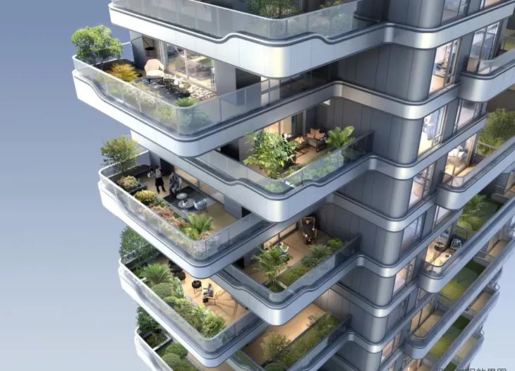 高低错落的空中露台,将花园搬到空中,赋予绿意盎然的自然观感,让建筑与自然对话。