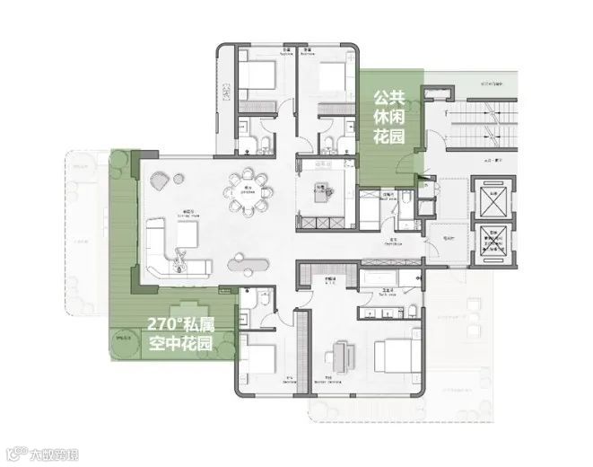 公共休闲绿化平台 ——内凹式巧妙设置公共休闲绿化平台,与户内空间完全脱开,既不会对户内造成遮挡,又与核心筒公区直接连接。超乎想象的户外空间面积,令其功能和场景更为多元化,真正实现生态住宅的花园生活。