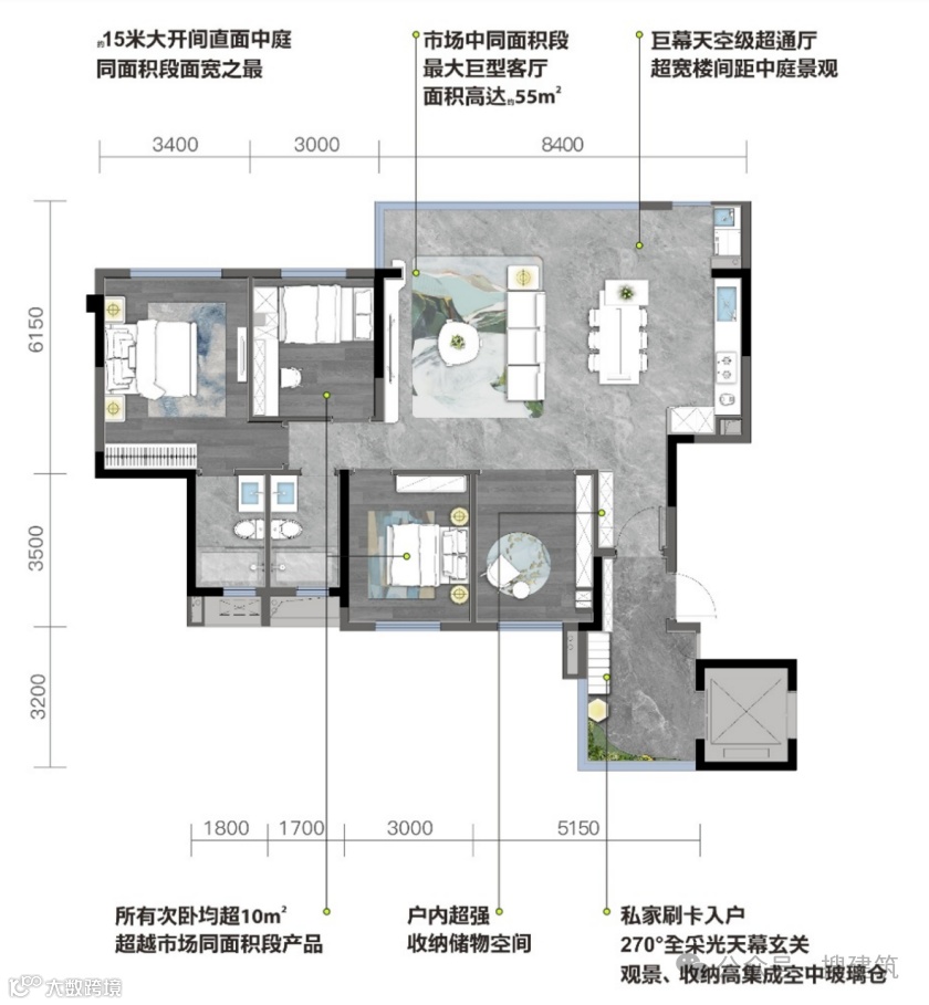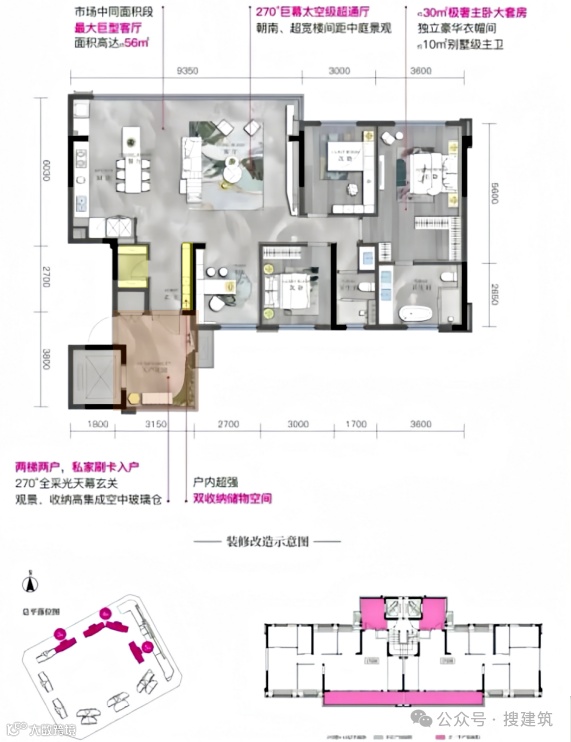 270°转角式设计,类似“阳台式独立电梯厅”,近似入户花园。