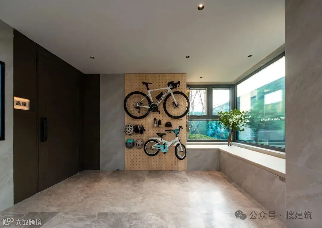 这个独立入户空间,不是常规的密闭空间,而是创造性的实现了全明、观景等作用,同时兼具收纳、储物等功能,电梯前厅面宽超过5m,实际使用面积超过13㎡,俨然就是一个“空中院子”。