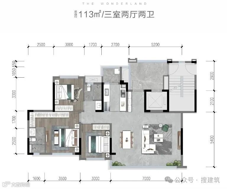 成都邦泰云璟建面约113㎡户型,2T2户的梯户比下,独立电梯前室面积有近10㎡。