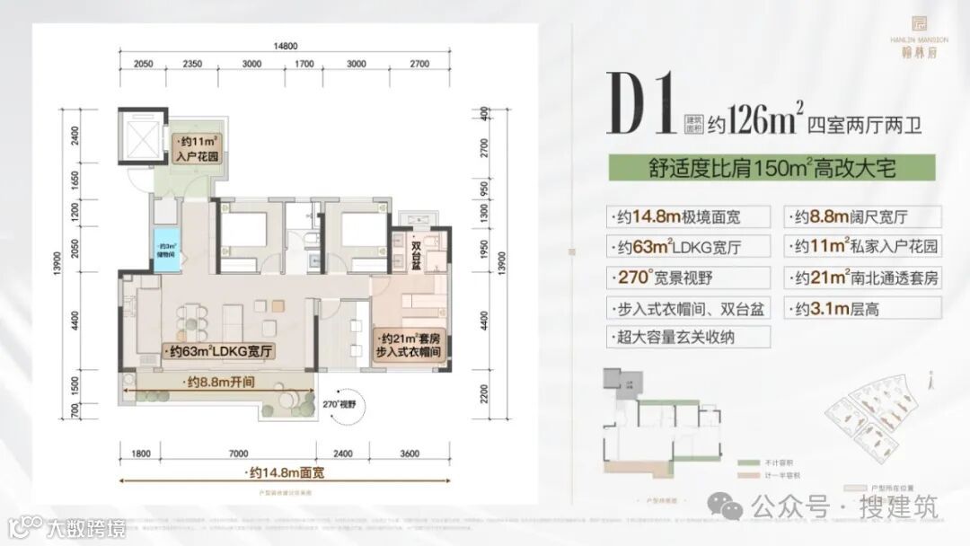 比如成都龙湖·天府晴川建面约128㎡户型,约12㎡独立电梯厅,营造出一个超大的充满情景化的家庭空间,并实现270°采光面,从入户方式开始,改善生活的品质就上升了一个维度。