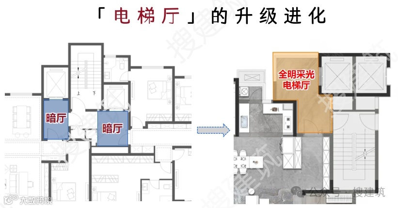 今天搜建筑和大家一起来聊下户型电梯厅的进化趋势——花园式全明采光电梯厅。