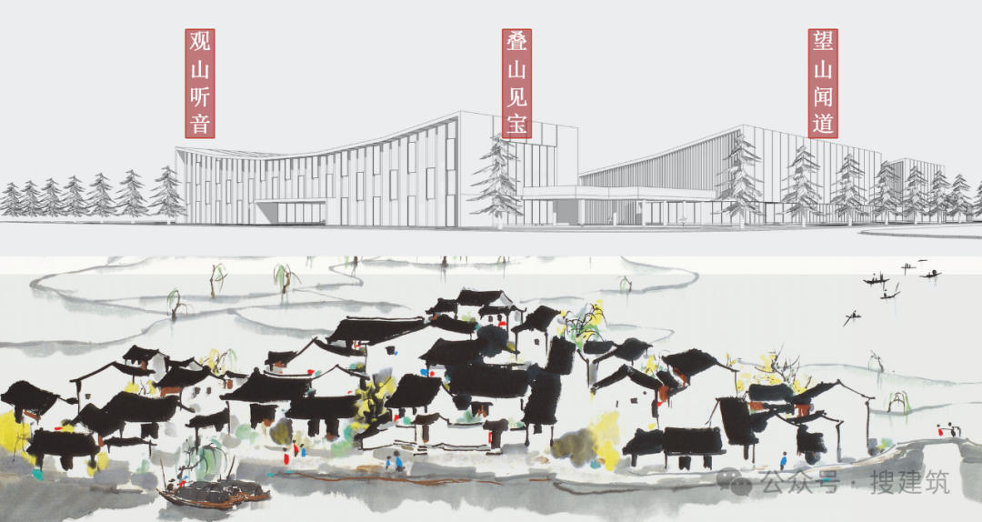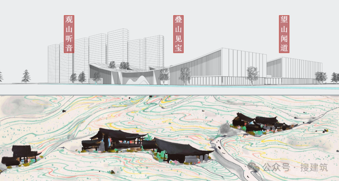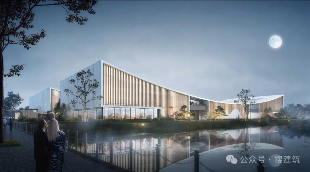 望山闻道,叠山见宝,观山听音。空间序列一次打开,领略“落霞与孤鹜齐飞, 秋水共长天一色”的恢宏开阔,又同时品味“一叶舟轻,双桨鸿惊”的婉约烂漫。总图设计依循传统官方建筑的严谨中轴线,立面形态采用极简的手法,注重比例和建筑尺度的控制。模块化的设计体现工业建筑的简洁高效,雅俗的建筑表达营造了精致高级的场所调性。