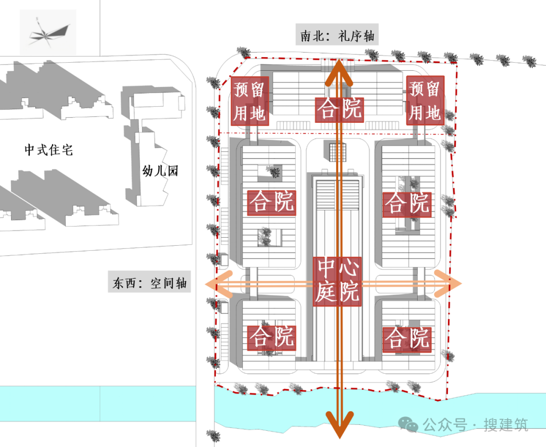 天际线设计顺接西侧高层住宅及多层幼儿园,形成完美的抛物线,将“山形”刻画;打开南侧沿河视野,“引水入园”,最大限度利用生态景观资源。在北侧金龙大道塑造完整的展示面,整体形成南低北高,东西高中间低,向中心汇聚的空间格局。“四水归堂、藏风聚气”,用现代手法诠释中国传统建筑的精髓,是文化自信也是文化回归。以承载人文为内涵,以生态自然为底色,立面设计采用现代中式风格,与西侧住宅形成统一风格。