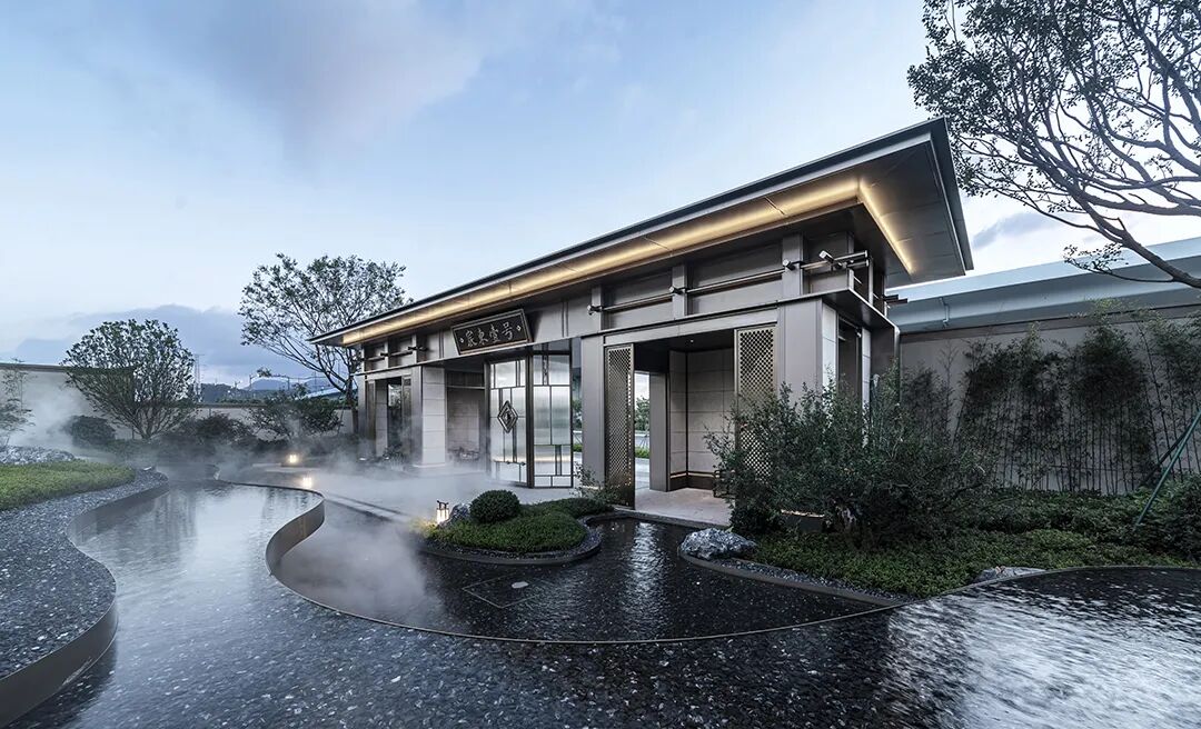 福建八闽文化多元,古建筑风格多样化,拥有充足的空间去提炼设计语言。前期作为示范区使用的售楼处设计,取福建建筑特有受海洋文化影响的起翘屋脊、古朴的屋面平瓦、官式大宅的开间比例,生活气息的亭台水榭等,融汇成宜和八闽之风格。