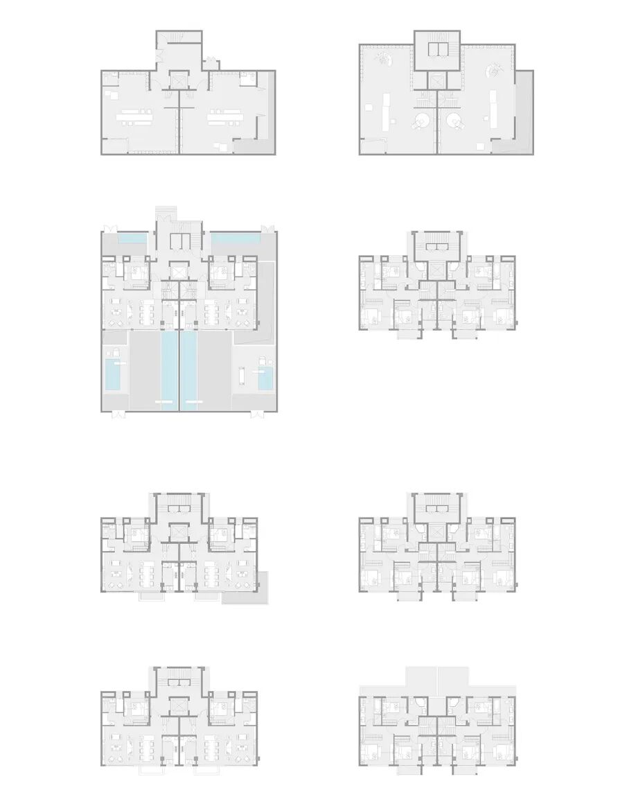 组团设计根据老泉州街巷邻里特性,以院落为单位,形成错落有致、疏密相间的空间格局。不同方向的多层组团围合形成丰富的社区空间,通过转向创造街区围合感和多元空间,每个街角都有非同质化的界面形象。