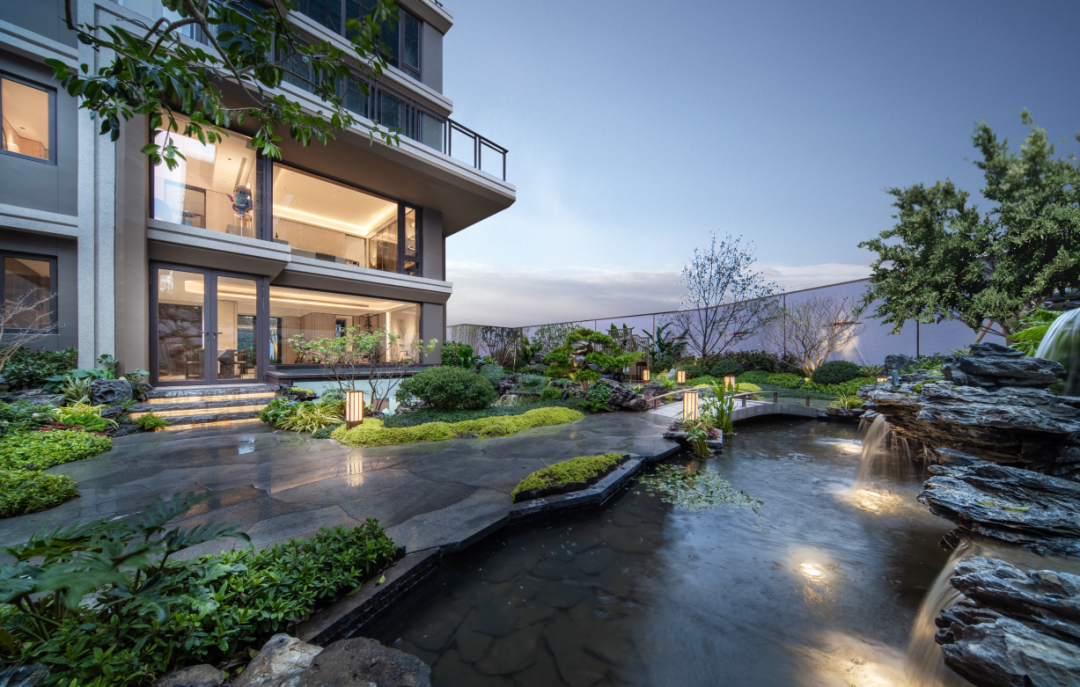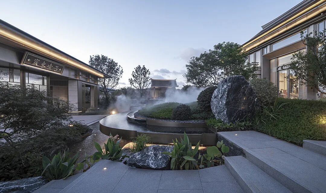 各组团内部的绿化走廊曲径蜿蜒,空间丰富、节奏感强;结合建筑的体块穿插,立面线条的流线造型,营造自然风情的度假氛围。多变的景观空间、开合的植物空间、社区互动的场景空间,将传统意境与现代设计融合,打造一座古典与现代相融合的新中式园林。