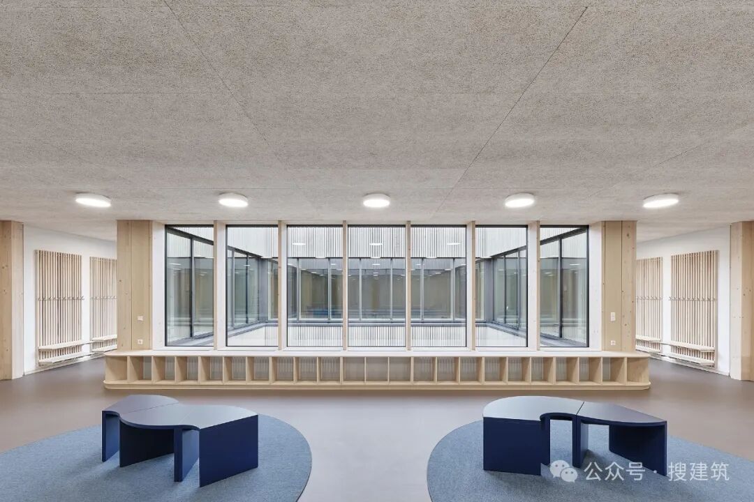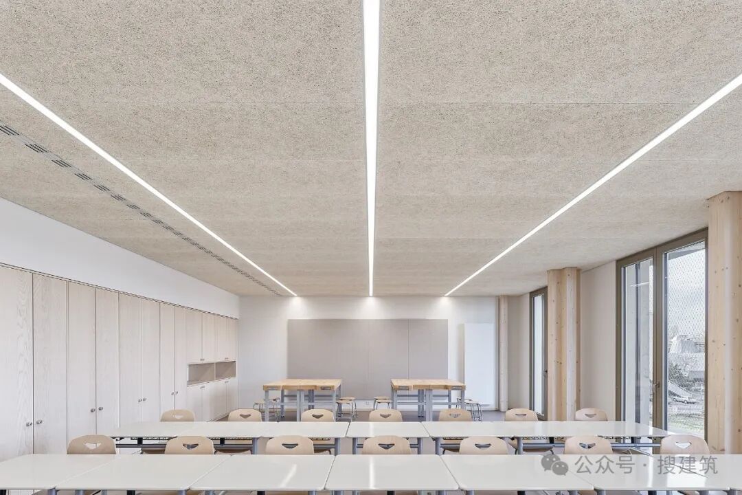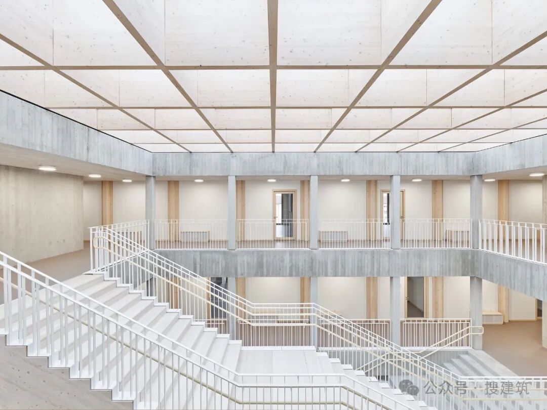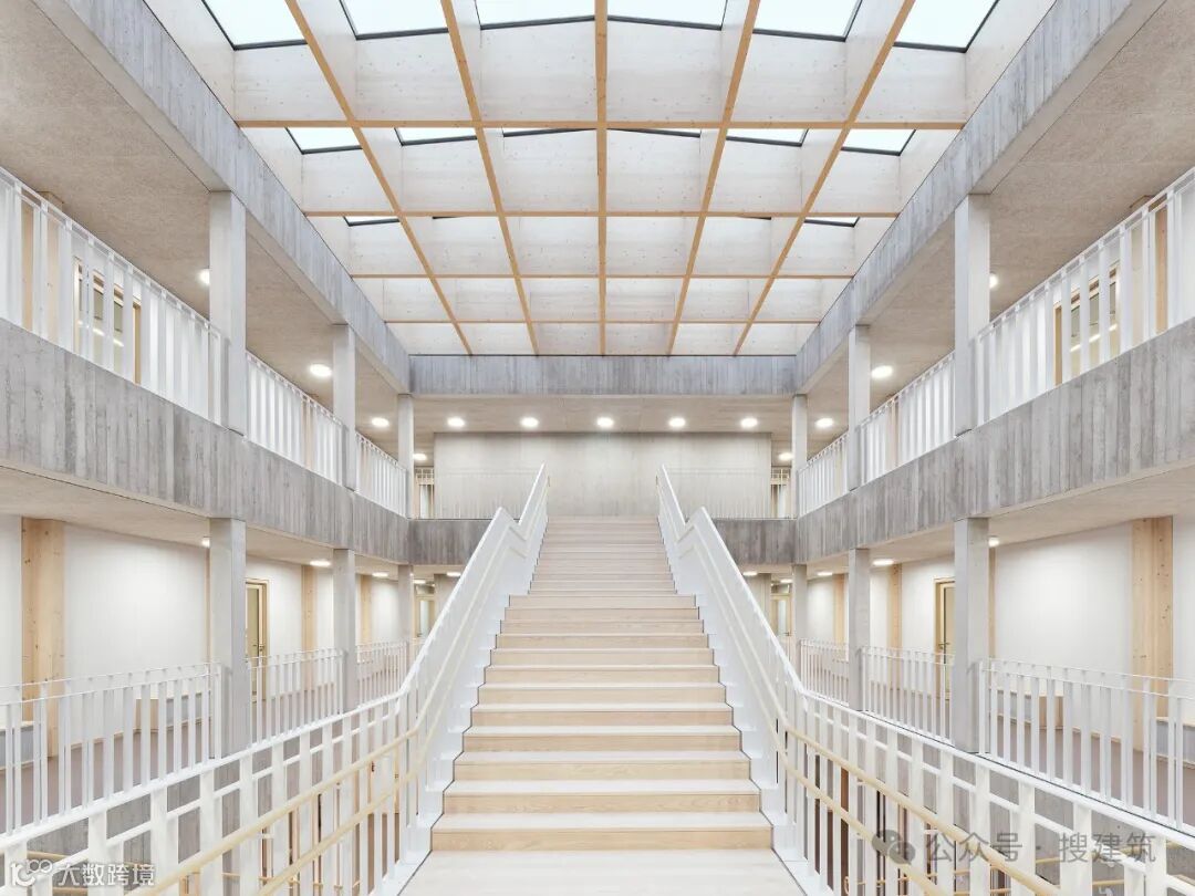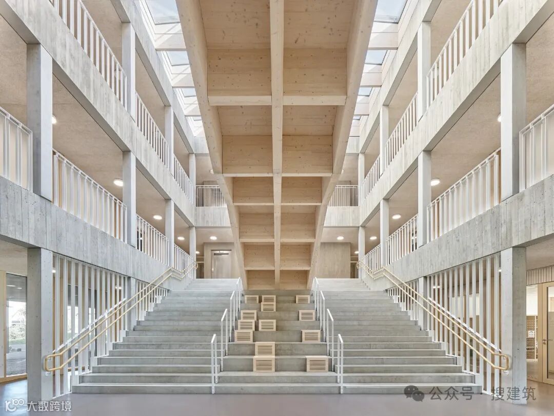 设计醒目的木质楼梯穿过露天空间,并由一个宽敞的天窗照亮。楼梯大厅不仅是入口区和学校操场之间的平滑过渡,也是休息和公共区域,是非正式交流的场所。楼梯大厅也是各楼层之间的连接和分配器。餐厅位于中央楼梯大厅的东侧,其多功能用途和毗邻的俱乐部厨房给人留下了深刻印象,是一个开放式的功能性会议场所。建筑两侧的大型玻璃窗为公共活动室提供了充足的日光,并将室内与室外区域连接起来。