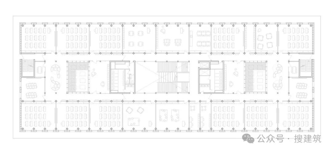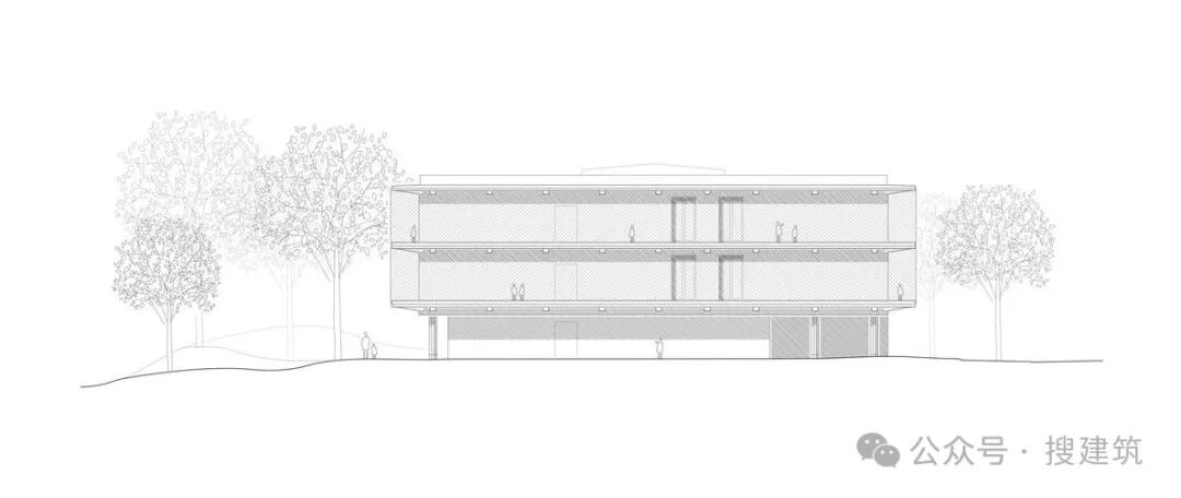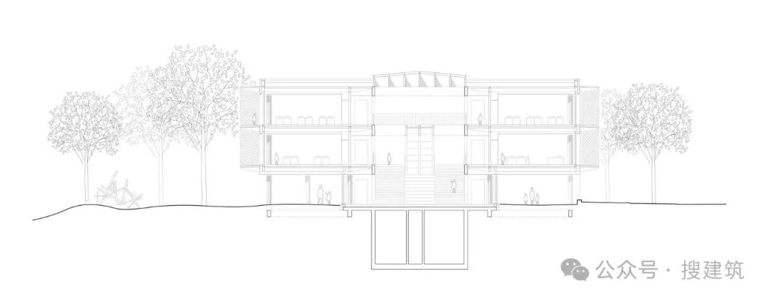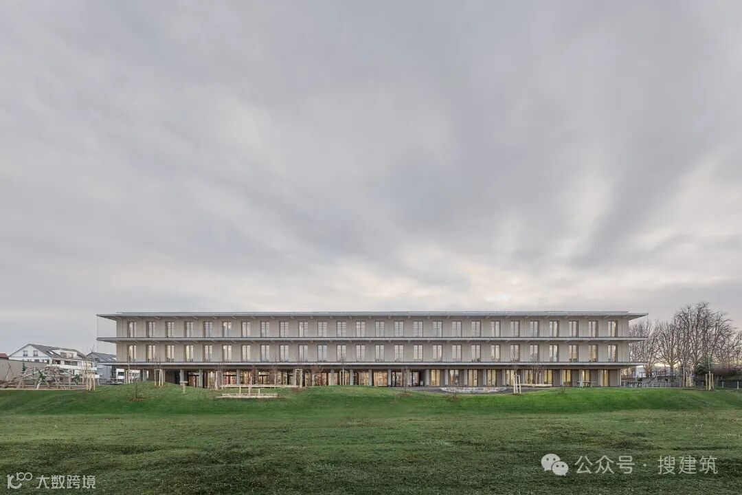 学校社区和学习小组之间的空间区分--在高层,中央楼梯大厅两侧各有一个学习小组。在内庭的照耀下,一个清晰的空间中心被组织起来,成为学习小组的理想中心。专家室、日托室和融合室分布在楼梯大厅两侧,连接着各学习小组。在这些房间之间,有一个内部混凝土核心区,内有所有服务设施,如各个学习单元的卫生设施。与教学楼群相连的是各个教室,教室通过至少三扇落地窗与周围的凉台相连。这不仅是一个逃生阳台,还可用作休息室,并能快速、方便地呼吸新鲜空气。铁丝网可作为周围阳台的防坠落装置,同时还能让教室获得充足的日光。