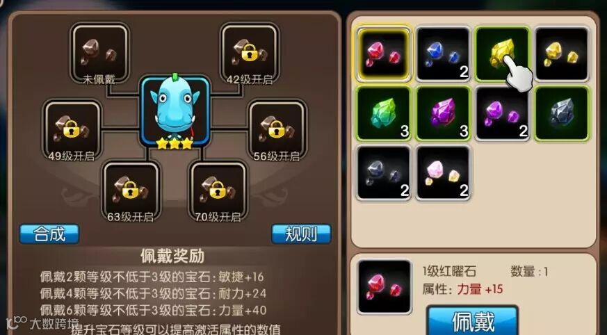 A:宝石是从外域打出来的,竞技场挑战胜利也有几率出,另外就是金币和符石十连抽啦!4个一级宝石合成1个二级宝石,4个二级宝石合成1个三级宝石,依此类推,最高可到六级宝石。