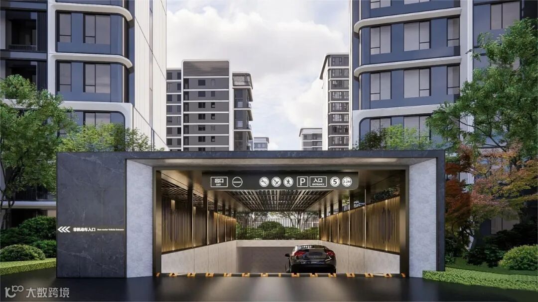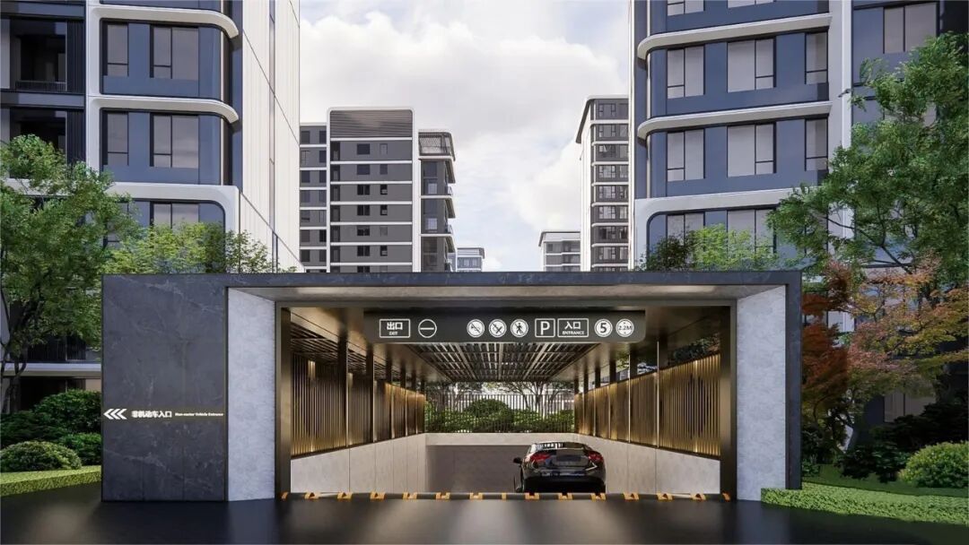 1.坡道入口顶盖/龙门牌作为客户车行归家的第一个空间节点,展示品质、形象和标识感;