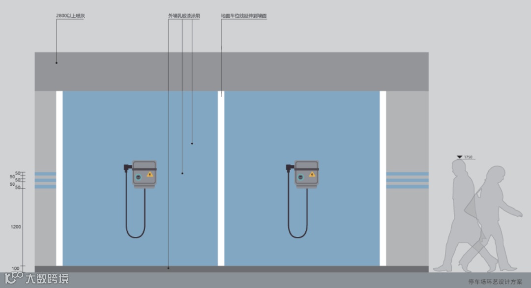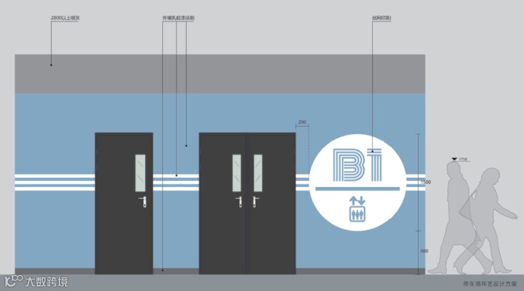 墙身颜色涂装高度2.8m对应3.3m层高地库,若地库层高增加应按比例提高涂装高度。标识及字体样式可根据项目需求调整。