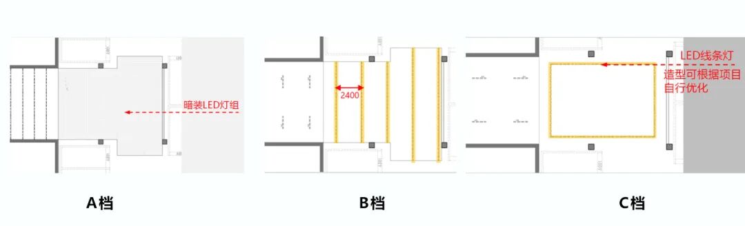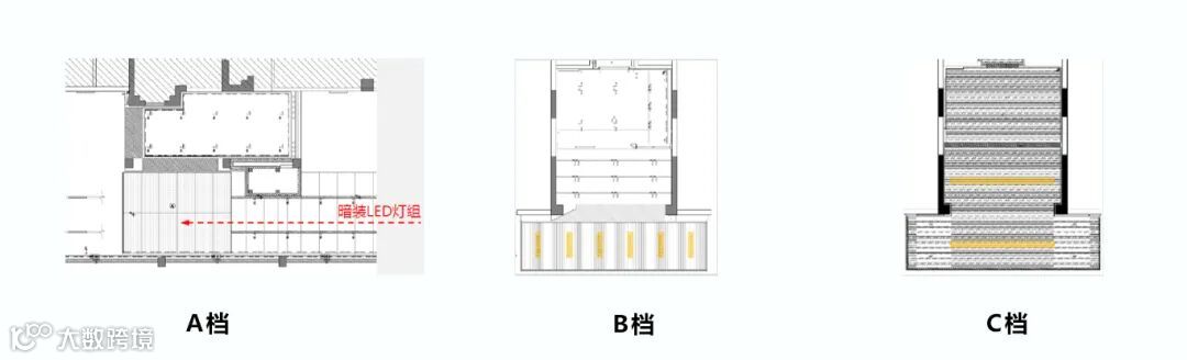 A档:1.穿孔铝板天花时为暗LED灯带,间距建议100~200mm/组,2.照度150~250lx;