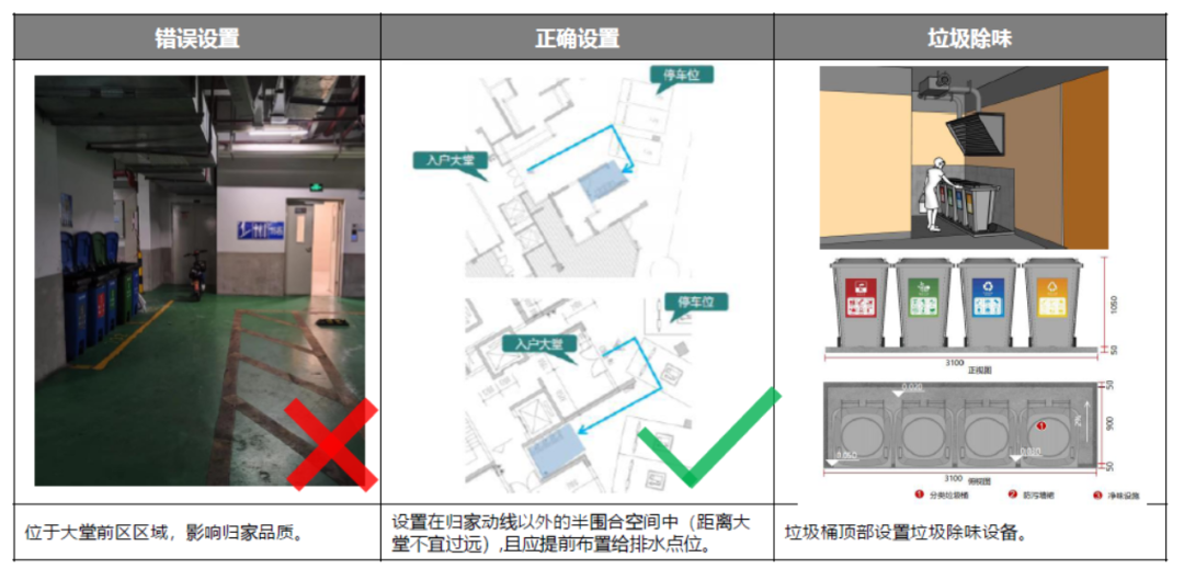 当需要在地下车库设置生活垃圾收集点时,应设置在地下车库半围合空间中(提前预留好给排水点位),避免设置在机动车位及入户大堂旁影响客户使用体验,收集点必须设置净味设施设备,避免异味在车库中扩散。