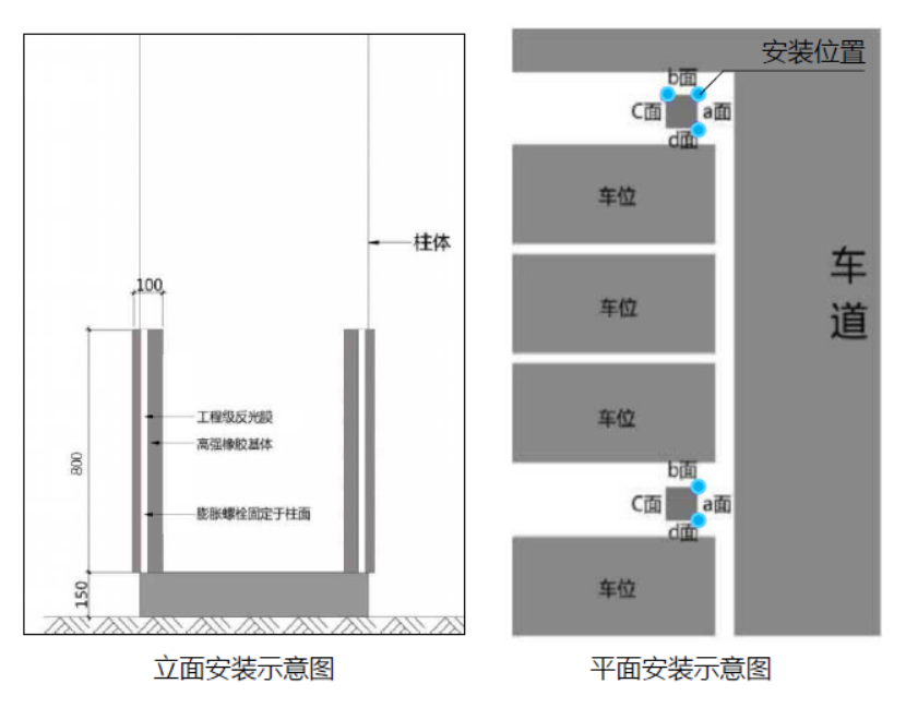 安装:可能被碰撞的墙角处,加设反光橡胶护角,膨胀螺丝固定。