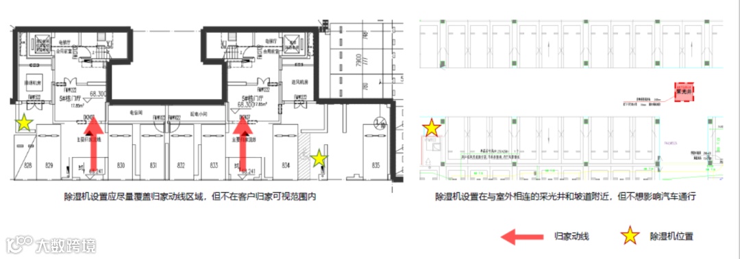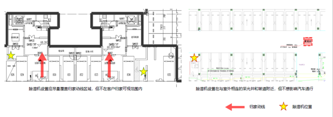 地下室因受季节性回南天影响会导致墙面结露、发、腻子脱落、地面及管道结露无法施工等问题,为保证地库干燥,项目应于地下室设置除湿机,设置原则为: