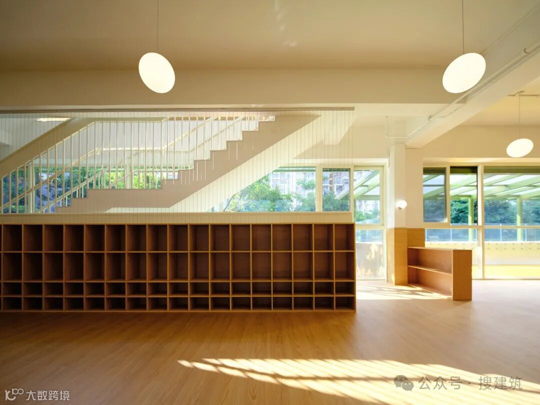 04 Shared corrider. Kindergarten teaching does not require fully enclosed classrooms like primary and secondary schools. By removing the partition walls between classroom and corridor, the classroom natural lighting can be improved and the scope of daily free activities for children will be expanded. This idea is in line with the theory of "time shared space" proposed by architect Jure Kotnik who is engaged in the design of kindergartens for a long term. Kotnik's research pointed out that when the school's learning, game, and living spaces are opened up as a free plane, children's self-awareness, learning ability, social skills, and physical fitness can all be improved.