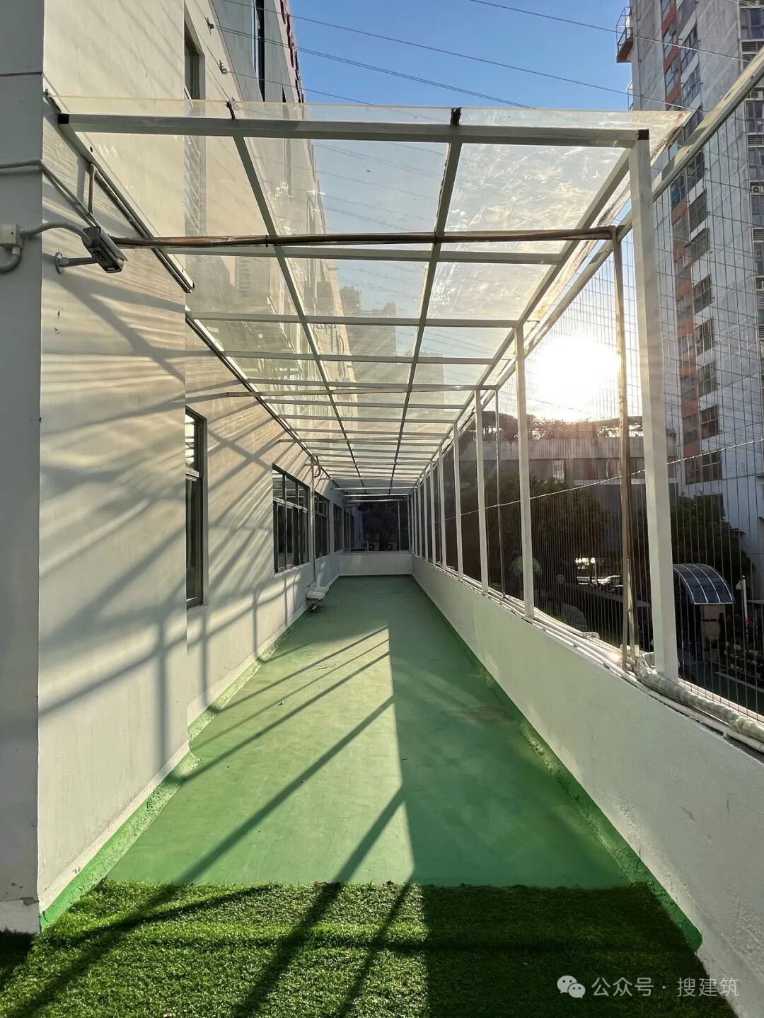 We replaced the glass shed on the second-floor platform with a new steel structure. The lightweight polycarbonate sheet roof filters direct sunlight and reduces the risk of falling objects with its own resilience. The soft yellow EPDM floor can not only protect the safety of children in daily outdoor activities, but also enhance the brightness of the indoor corridor through light diffuse reflection. The solid wall between the platform and the corridor were replaced by glass floor-to-ceiling doors and windows, which not only introduce the scenery and sunlight into the building, but also connect the indoor and outdoor, attracting children to explore on the outdoor platform spontaneously.
