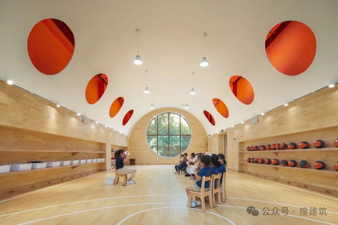 在拱顶两侧设置的圆洞既可让声波穿过吊顶被布置在墙、顶面的橙色吸音板吸收,解决了拱面带来的拢音回声问题,又能作为空调风口,并在视觉上让人联想到篮球、太阳等意向。于是,一面吊顶同时处理了空间、心理、声学、设备、审美等问题。与拱顶配合,木地板上翻形成适合儿童尺度的墙裙及壁龛,强化了空间包裹感。空间两端的大型拱窗和圆窗为室内带来充足自然光线,也让音体室成为概念故事中的“树洞”空间,被园方命名为“暖阳大厅”。吊灯、投光灯与轨道射灯的组合则能满足房间的多功能属性,为音乐舞蹈、演出会议等活动提供不同照明方案。