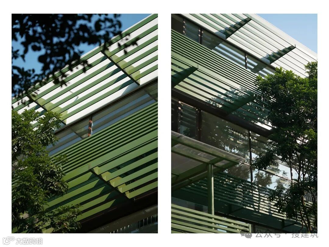 为改善室内采光,我们把音体室立面窄窗改为大型圆、拱窗,并在东南立面的教室窗外安装了反光板。在西北立面,我们将走廊窗洞扩至极限,并设置了遮阳百叶、空调机罩和首层、二层平台的檐廊,它们共同形成多条如同层叠的树盖般横贯整个立面的绿色水平线条,充分利用建筑本身横向展开的体量比例,简单而强势地统合了改造前纷乱凹凸的外观,构成新的建筑形象。音体室的圆窗则如同透过树荫升起的初阳,成为主立面的点睛标志。