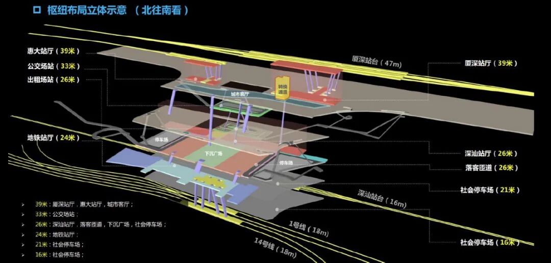 项目南临既有厦深铁路与亚公顶森林公园,整体地势呈南高北低,地块内有着三级高差。五条轨道工程由于规划时序与条件差异,均处于不同标高:既有需要保护的现状地面铁路线和即将开工的地下轨道,又要预留空间,为未来的高架铁路进入枢纽而提供改造升级的条件。