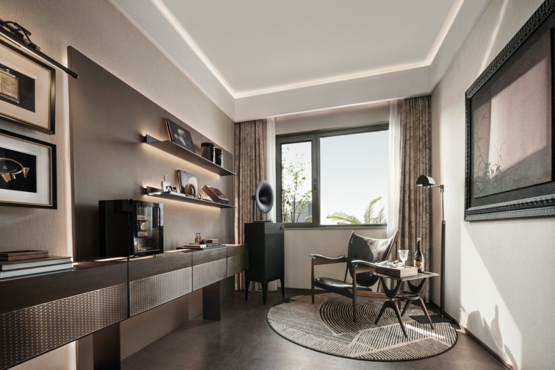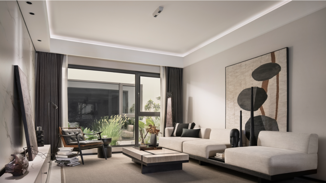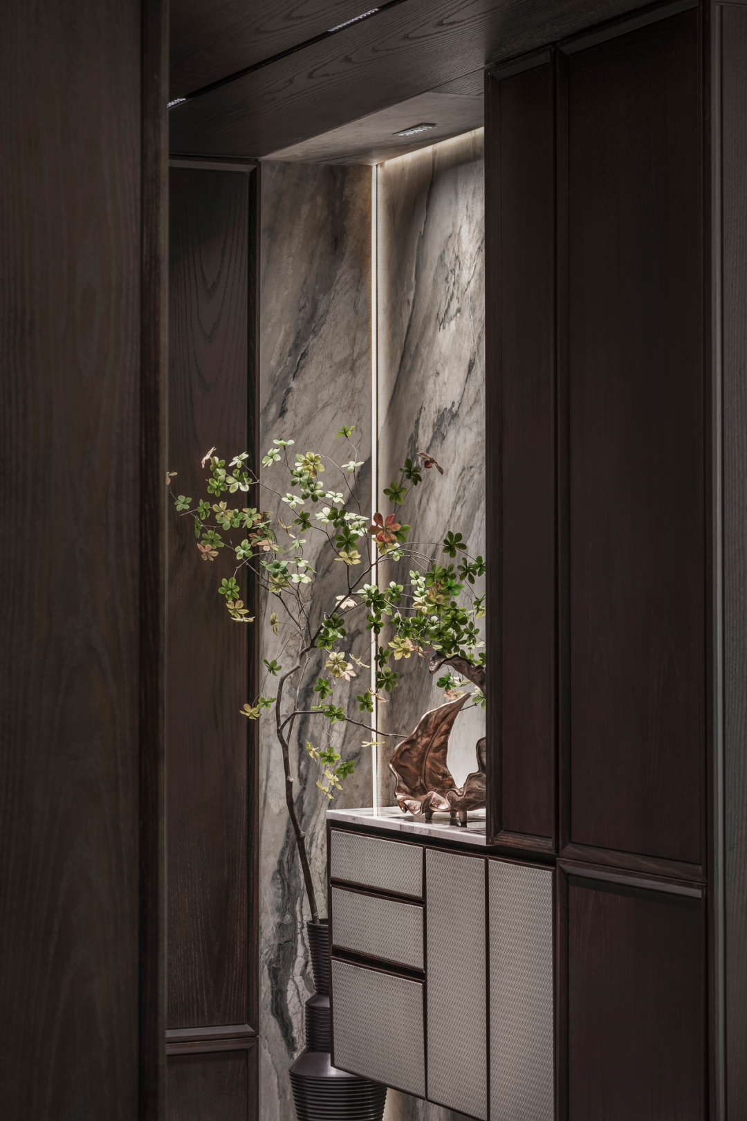 豪华巨厅开阔的尺度彰显主人的身份,酒店式灯光设计为空间的氛围做渲染,自然纹理的木饰面搭配哑光的地材增加空间的质感,整个巨厅的顶面无梁设计增加了空间的开阔感。