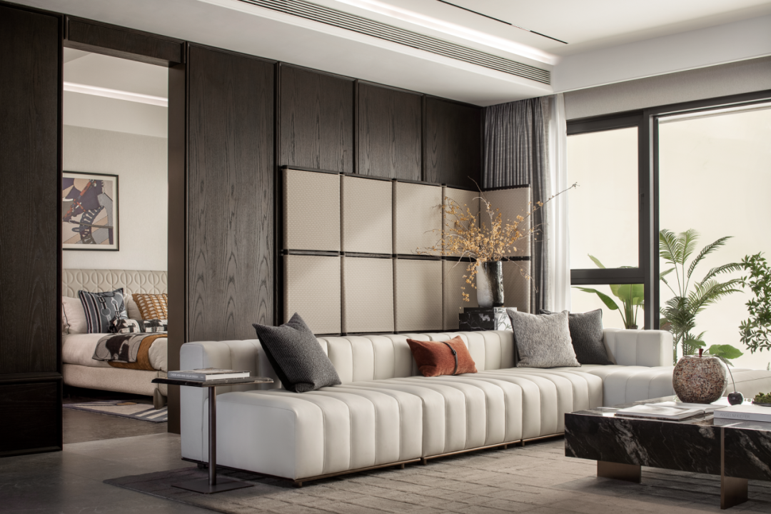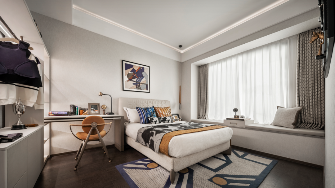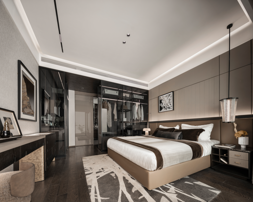 通过仪式感的衣帽间进入到主人的休息空间,床头背景阵列感的分割增加空间的秩序感,悬浮吊顶搭配温馨的灯光增加卧室的舒适氛围。