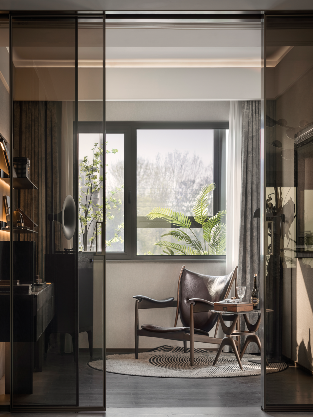 临近餐厅的另一侧为半开放书房、既可以作为书房使用也可以当作第二会客厅,可开合的推拉门满足空间开合的转变。