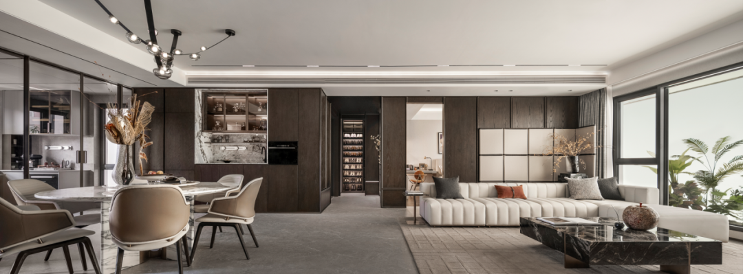 餐厅两侧分为展示区和西厨区,不同生活场景在这里都能被满足,家宴、会客等在这宽阔尺度的空间更为自由和舒展。