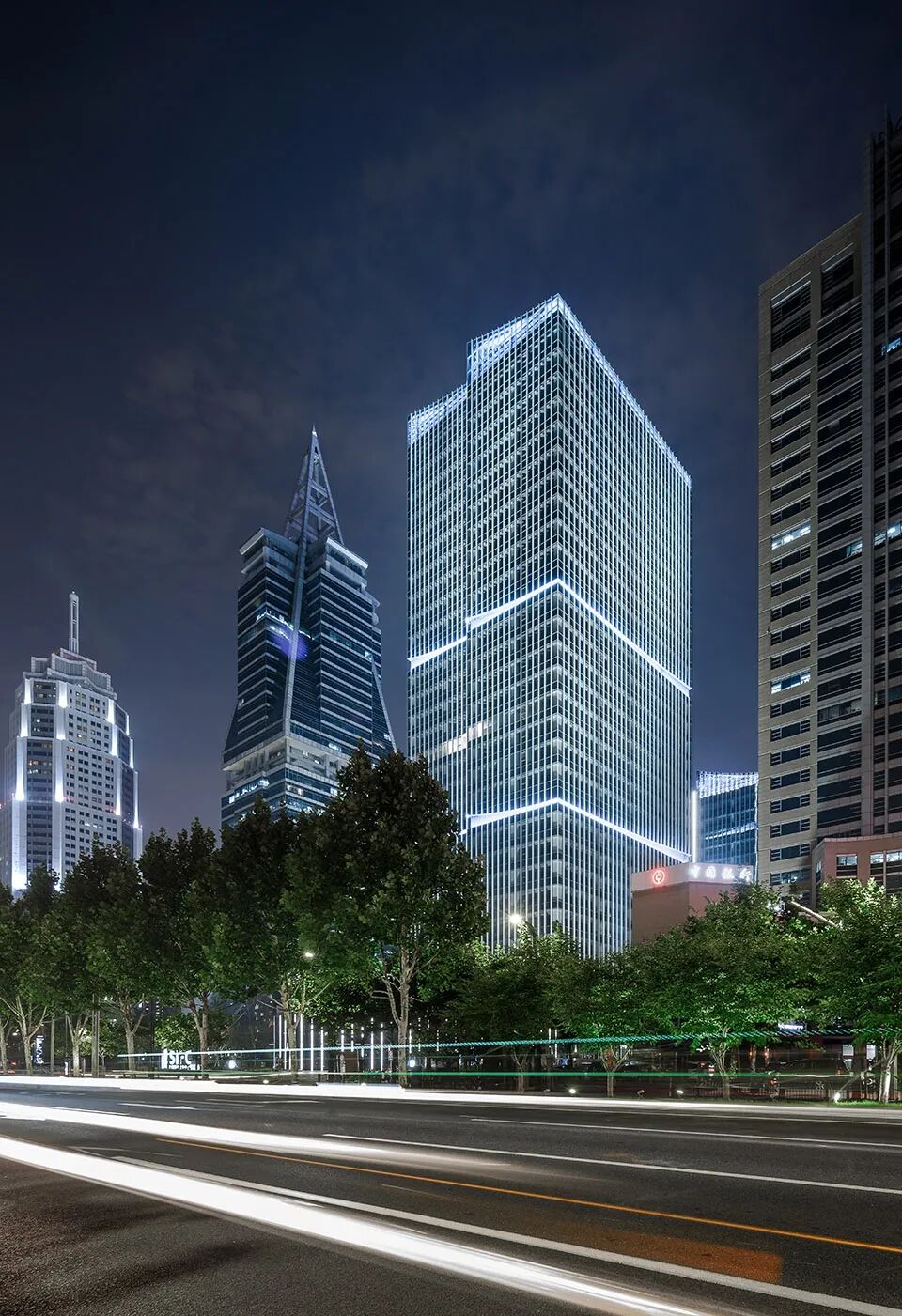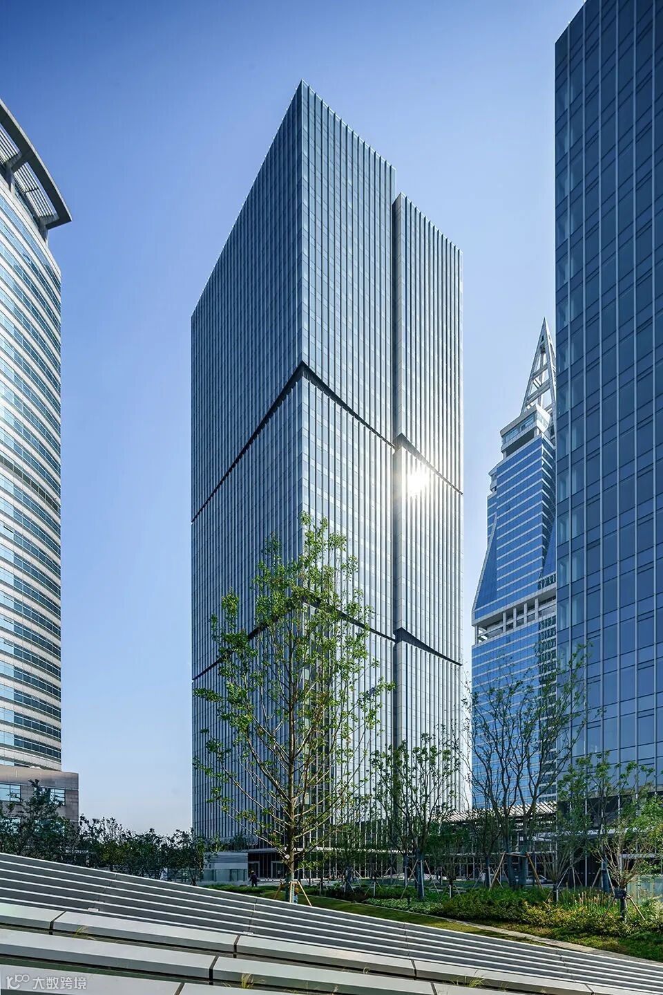 合肥金融广场的办公楼单体的表皮采用理性、克制的菱形母题做法,营造出干净简洁的立面,与现代办公的气质相符合。